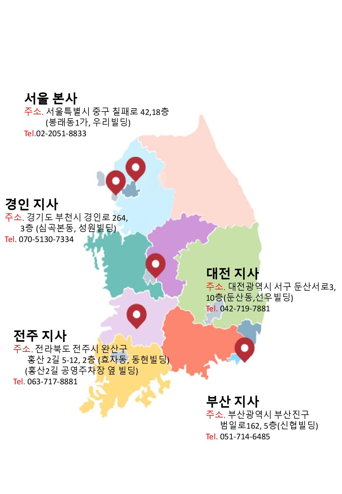 아래 각 지사 분포도 및 지사별 상세 주소 소개합니다.