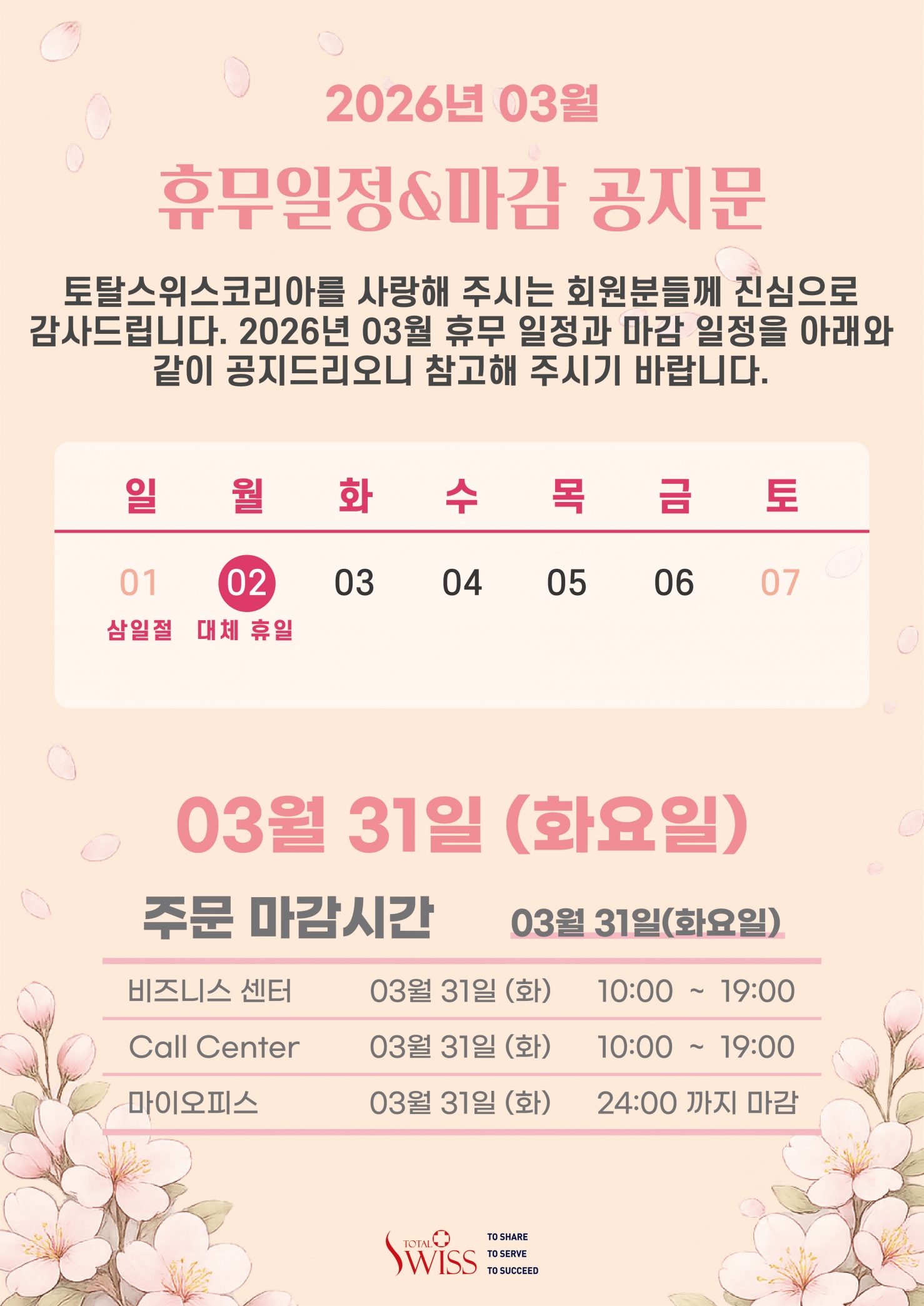 2026년 03월 휴무일정&마감 공지문